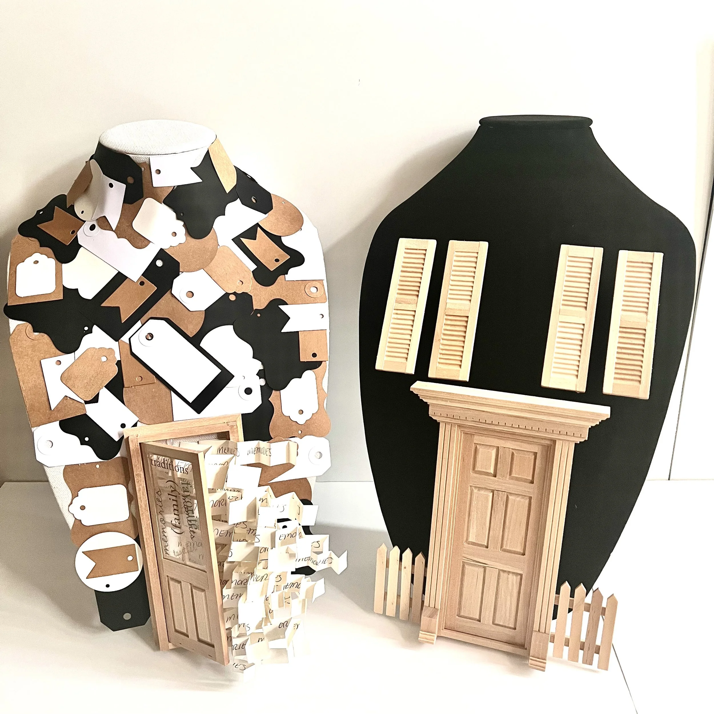 Releasing Labels This piece reflects how I used mindfulness to let go of negative self-labels, allowing me to fully enjoy the present moment rather than feeling overwhelmed. The black sculpture represents my former tendency to shut down, while the other sculpture illustrates my new ability to embrace the moment. The sculpture on the left features an open door, with memories flowing out, alongside blank labels to which I no longer feel attached.