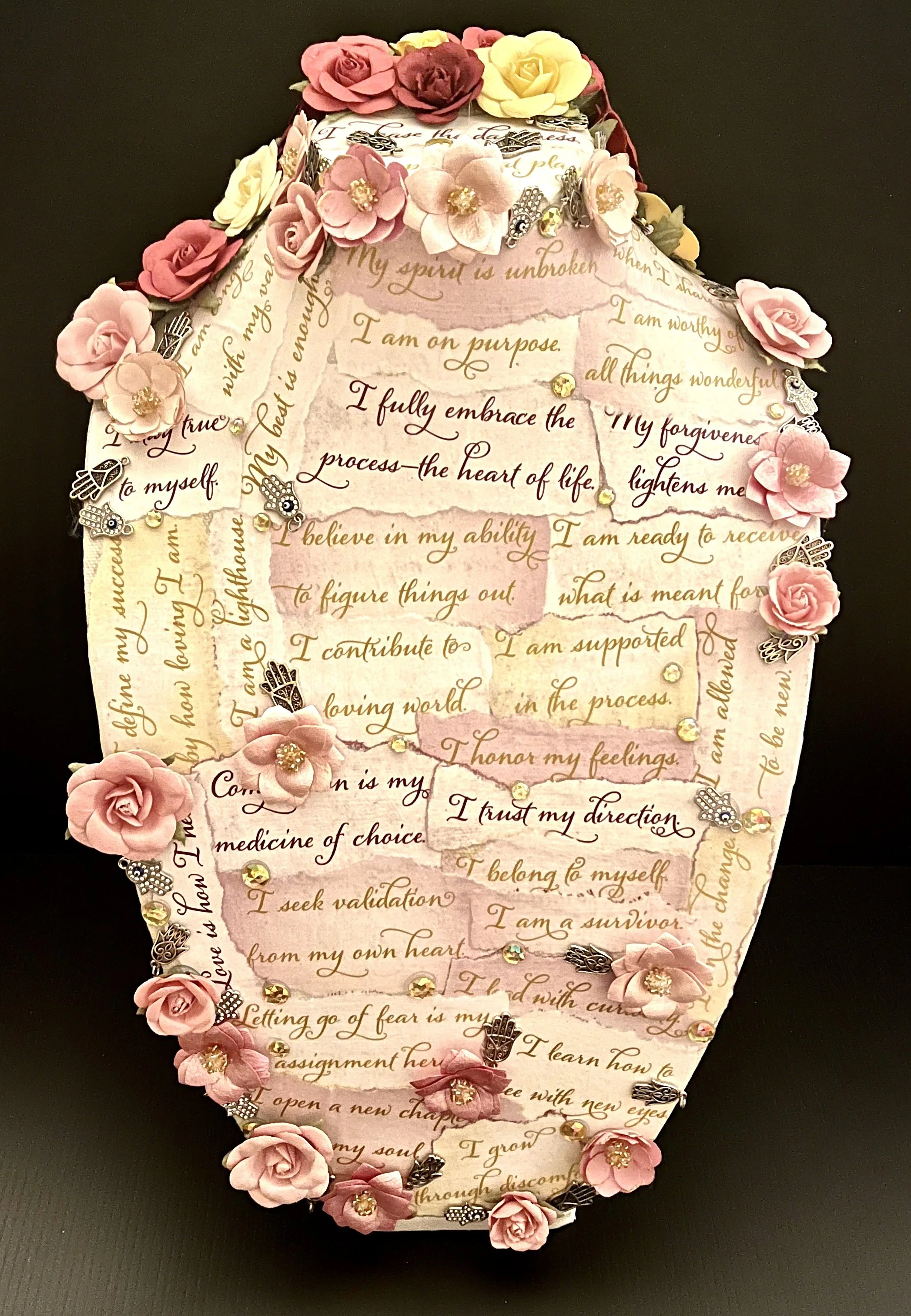 What's Being Born? This piece symbolizes self-compassion and self-love. I selected quotes that illustrate self-kindness and self-love for this work, along with flowers that represent growth.