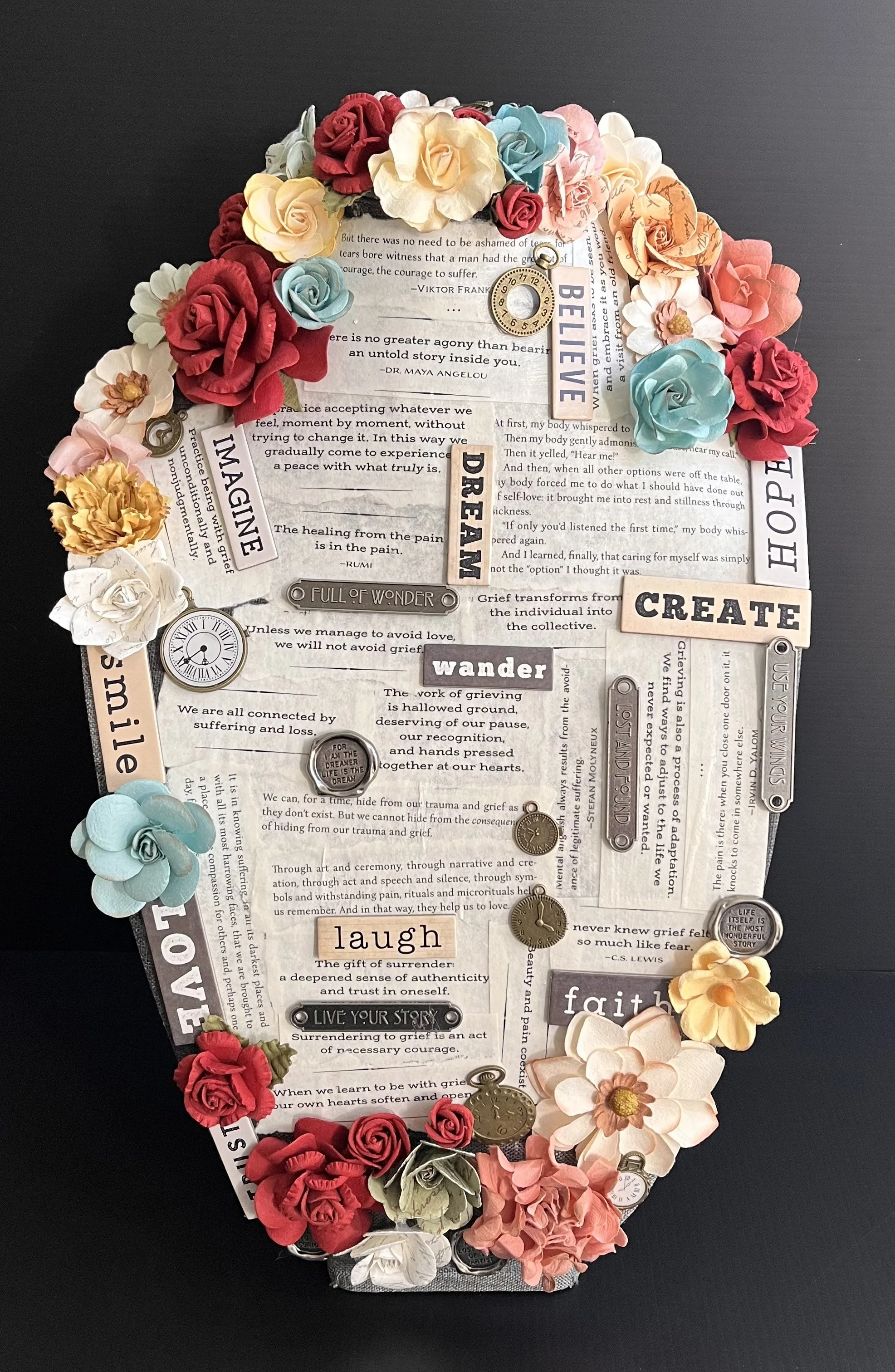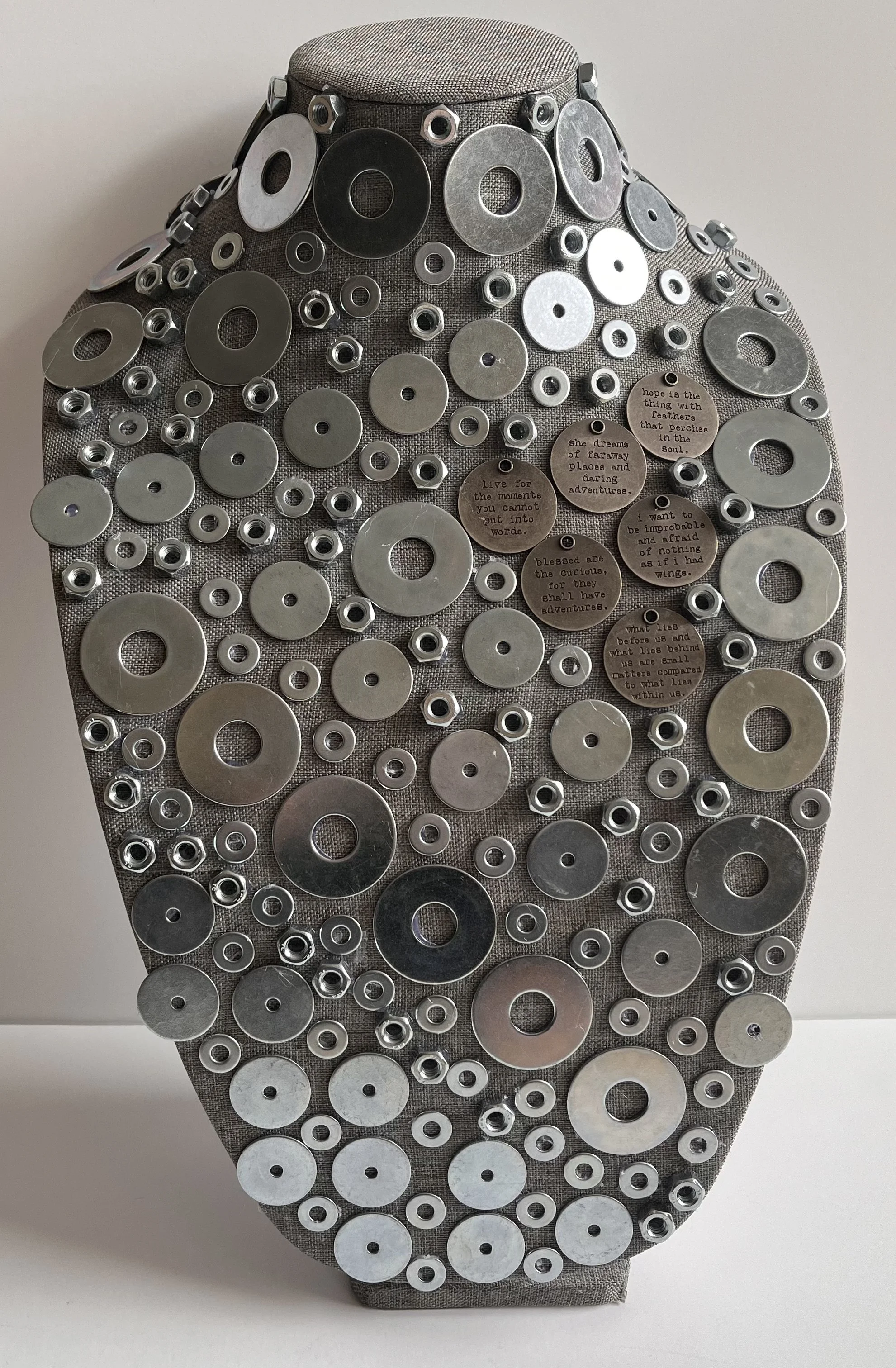 What’s Being Mourned? This piece reflects my experience with sadness. I selected quotes about grief and arranged them across the breastplate, alongside characteristics of joy. I believe you cannot selectively numb your emotions. When I allowed myself to feel sadness, I also discovered joy.